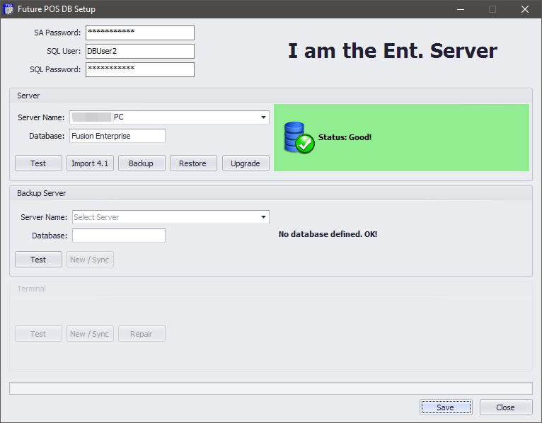 After installing FPOS Enterprise, users must configure an Enterprise Server database in DB Setup. Future POS, Inc. recommends using the blank Fusion Enterprise database provided in the Dealer Portal. This database contains the basic Enterprise information needed for Enterprise initial setup.