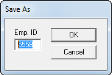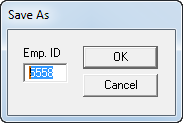 - In the Enterprise Employee Maintenance window, click File > Save. The Save As dialog will open with the next Employee ID available listed under Emp. ID.
