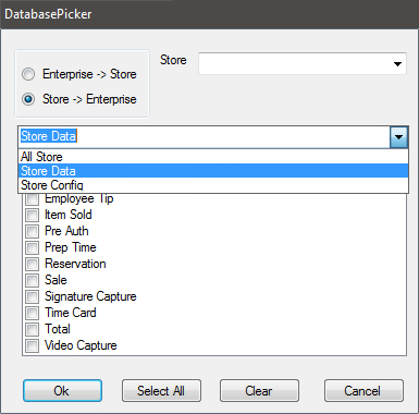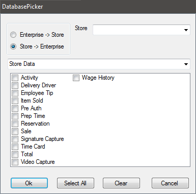 - Select data to sync from the Store Data drop down. Select specific tables to sync by clicking the check box to the left of the table's name or select all tables by clicking the Select All button.